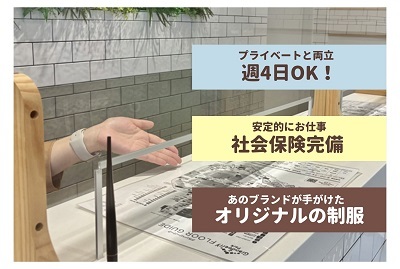 | 勤務時間 | 【勤務曜日・日数】 すべての曜日のうち 週4日 ※曜日の固定はできません 【勤務時間】 ・9:30~17:30 ・10:00~18:00 ・11:30~19:30 ・12:30~20:30 (昼休憩60分 実働7時間) ※時間の固定はできません 【休日】 ・シフト以外の日 |